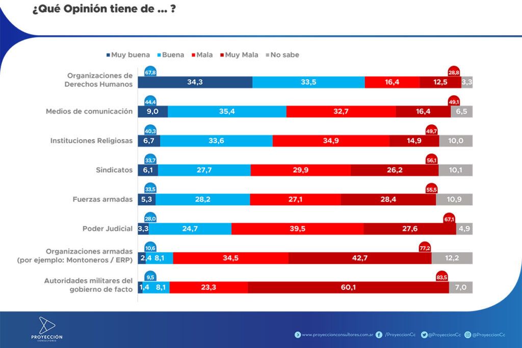 Según un relevamiento de la consultora Proyección, el 73,8% de las personas consultadas aprueba las políticas desarrolladas desde el retorno de la democracia. Además, siete de cada diez consideran que durante la última dictadura existió un plan sistemático de torturas y desapariciones, lo que refuerza el reconocimiento social del terrorismo de Estado.