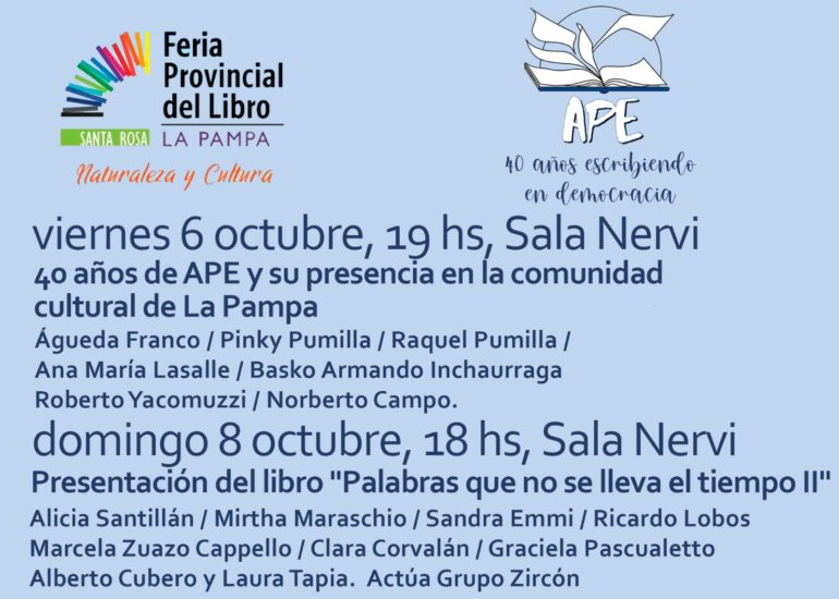 El conversatorio de APE se realizará el viernes 6 de octubre, a las 19 hs, en la Sala Nervi y festejará los 40 años de la agremiación de escritorxs y su presencia en la comunidad cultural de La Pampa. El panel será moderado por la escritora Graciela Pascualetto y estará integrado por la poeta Águeda Franco, por el periodista, escritor y militante por los Derechos Humanos Pinky Pumilla y la artista plástica y militante por los Derechos Humanos Raquel Pumilla. Con una propuesta audiovisual se sumarán a esta actividad la poeta Ana María Lasalle y el escritor Basko Armando Inchaurraga. Actuarán los músicos Roberto Yacomuzzi y Norberto Campo.