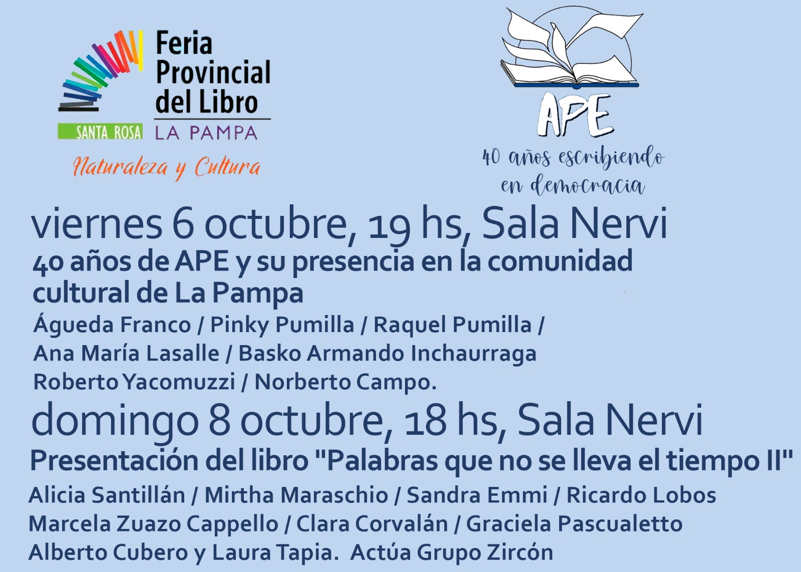 El conversatorio de APE se realizará el viernes 6 de octubre, a las 19 hs, en la Sala Nervi y festejará los 40 años de la agremiación de escritorxs y su presencia en la comunidad cultural de La Pampa. El panel será moderado por la escritora Graciela Pascualetto y estará integrado por la poeta Águeda Franco, por el periodista, escritor y militante por los Derechos Humanos Pinky Pumilla y la artista plástica y militante por los Derechos Humanos Raquel Pumilla. Con una propuesta audiovisual se sumarán a esta actividad la poeta Ana María Lasalle y el escritor Basko Armando Inchaurraga. Actuarán los músicos Roberto Yacomuzzi y Norberto Campo.