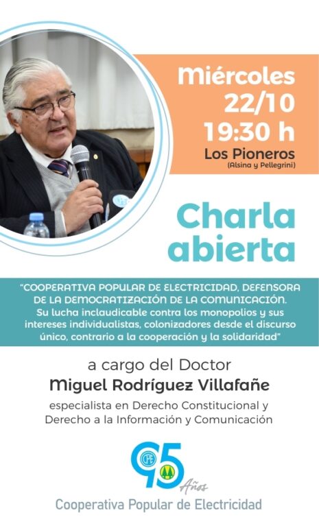 Este miércoles 22 de octubre, desde las 19:30 horas, el reconocido especialista en Derecho Constitucional y Derecho a la Información y Comunicación, doctor Miguel Rodríguez Villafañe, ofrecerá una charla abierta en Los Pioneros, bajo el título «COOPERATIVA POPULAR DE ELECTRICIDAD DEFENSORA DE LA DEMOCRATIZACIÓN DE LA COMUNICACIÓN – Su lucha inclaudicable contra los monopolios y sus intereses individualistas, colonizadores desde el discurso único, contrario a la cooperación y la solidaridad».