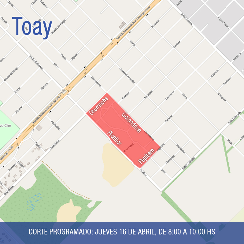 El primero de los cortes será este jueves 16 de abril en el barrio Villa Emilio, en Toay. La interrupción se extenderá entre las 8:00 y las 10:00 horas, y afectará la zona comprendida por las calles Churrinche, Golondrina, Pepitero y Picaflor.