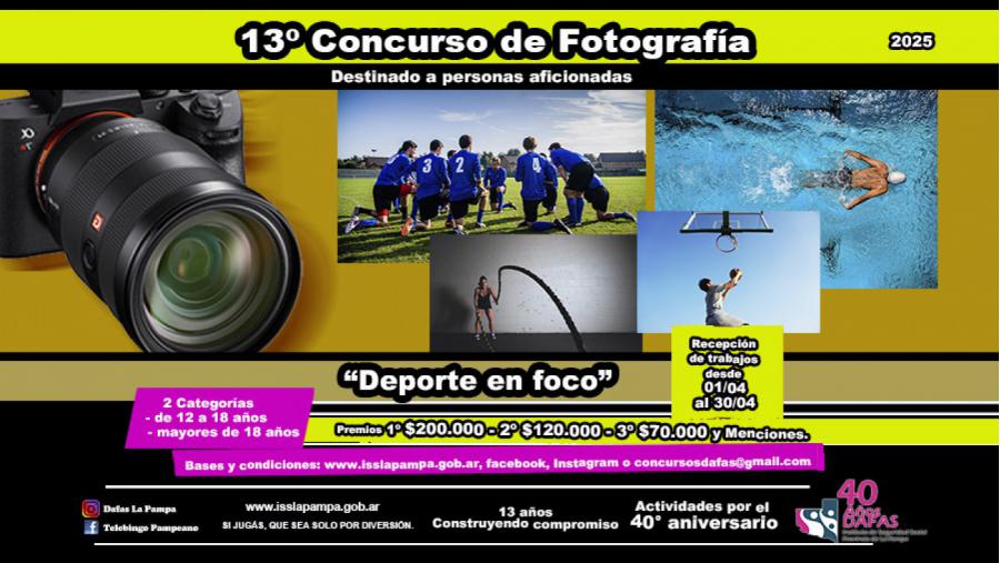 La Dirección de Ayuda Financiera para la Acción Social (DAFAS) invitó a personas aficionadas a la fotografía residentes en La Pampa, a participar durante todo el mes de abril del 13° concurso de fotografía digital “Deporte en foco”, actividad que integra un amplio programa anual de actividades por el 40° aniversario de la institución.