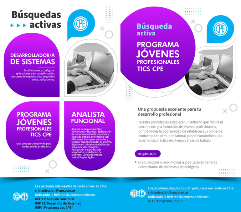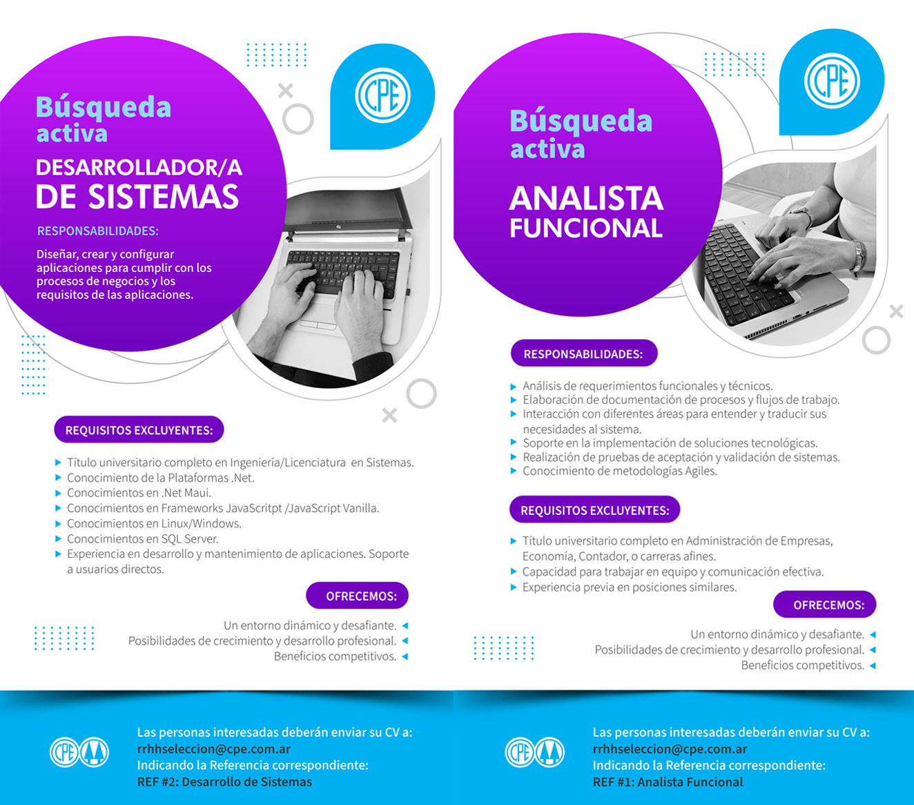 Los y las interesadas deben enviar su CV a rrhhseleccion@cpe.com.ar indicando la referencia correspondiente: REF #1: Analista Funcional o REF #2: Desarrollo de Sistemas