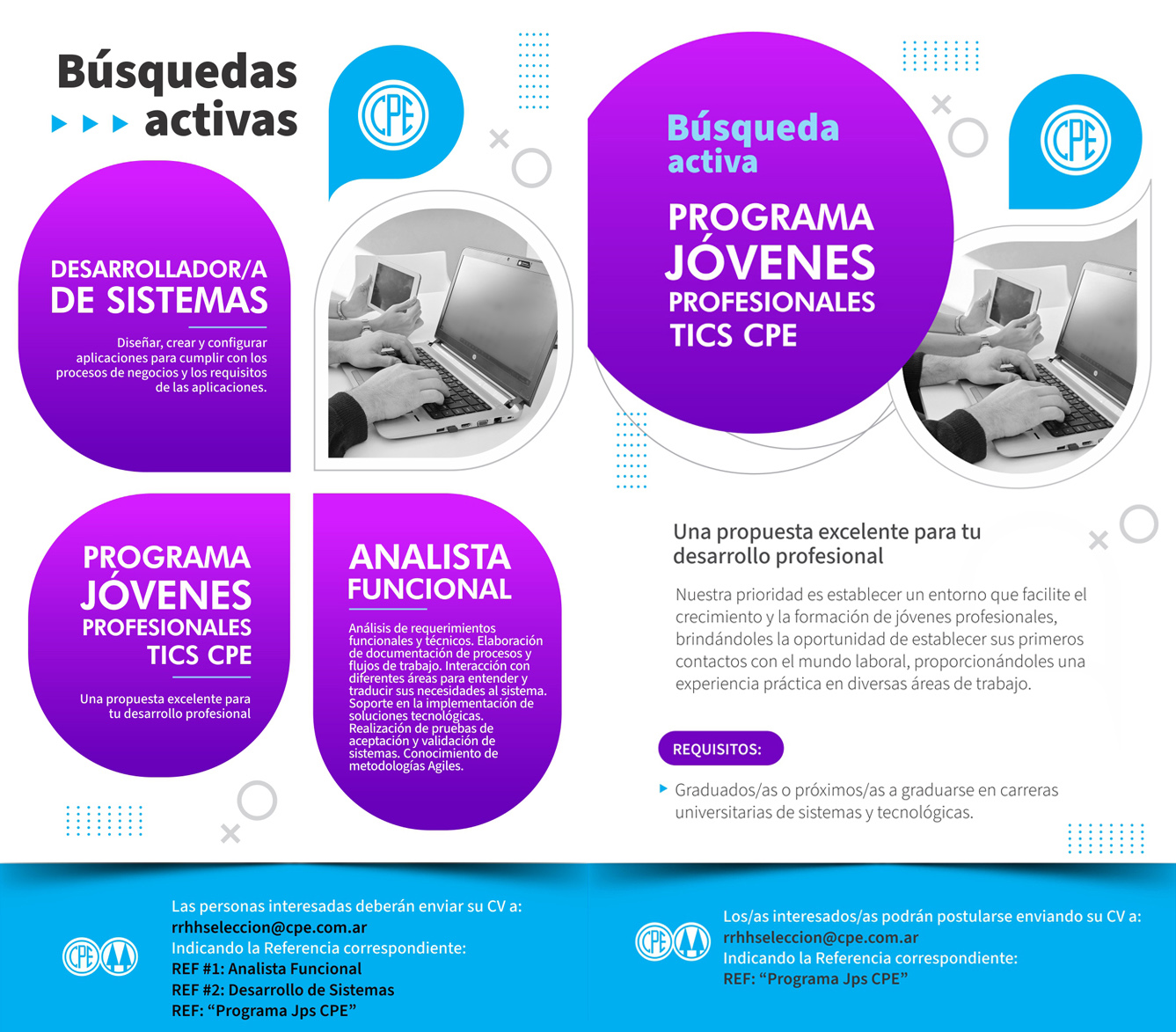 En forma simultánea, la CPE también ofrece la posibilidad de enviar curriculums y antecedentes en el marco del programa Jóvenes Profesionales TICS. Para este programa los requisitos incluyen ser graduados/as o próximos/as a graduarse en carreras universitarias de sistemas y tecnológicas. La prioridad desde la Cooperativa es establecer un entorno que facilite el crecimiento y la formación de jóvenes profesionales, brindándoles la oportunidad de establecer sus primeros contactos con el mundo laboral, proporcionándoles una experiencia práctica en diversas áreas de trabajo. Los interesados/as pueden postularse enviando su cv a: rrhhseleccion@cpe.com.ar indicando Ref. «Programa Jps CPE».
