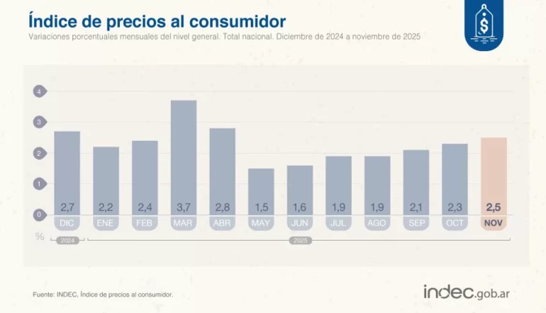 El Índice de Precios al Consumidor (IPC) registró en noviembre una suba del 2,5%, informó este jueves el INDEC. El dato marca una nueva aceleración respecto del 2,3% de octubre y consolida una inflación acumulada del 27,9% en los primeros once meses del año. En términos interanuales, la variación de precios trepó al 31,4%.