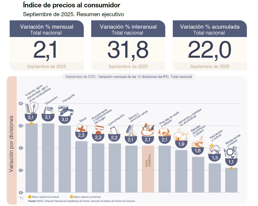 Según el INDEC, la división con mayor incidencia en la inflación de septiembre fue alimentos y bebidas no alcohólicas, excepto en la Patagonia, donde transporte tuvo mayor peso. En tanto, recreación y cultura (1,3%) y restaurantes y hoteles (1,1%) fueron las categorías con menor variación mensual.