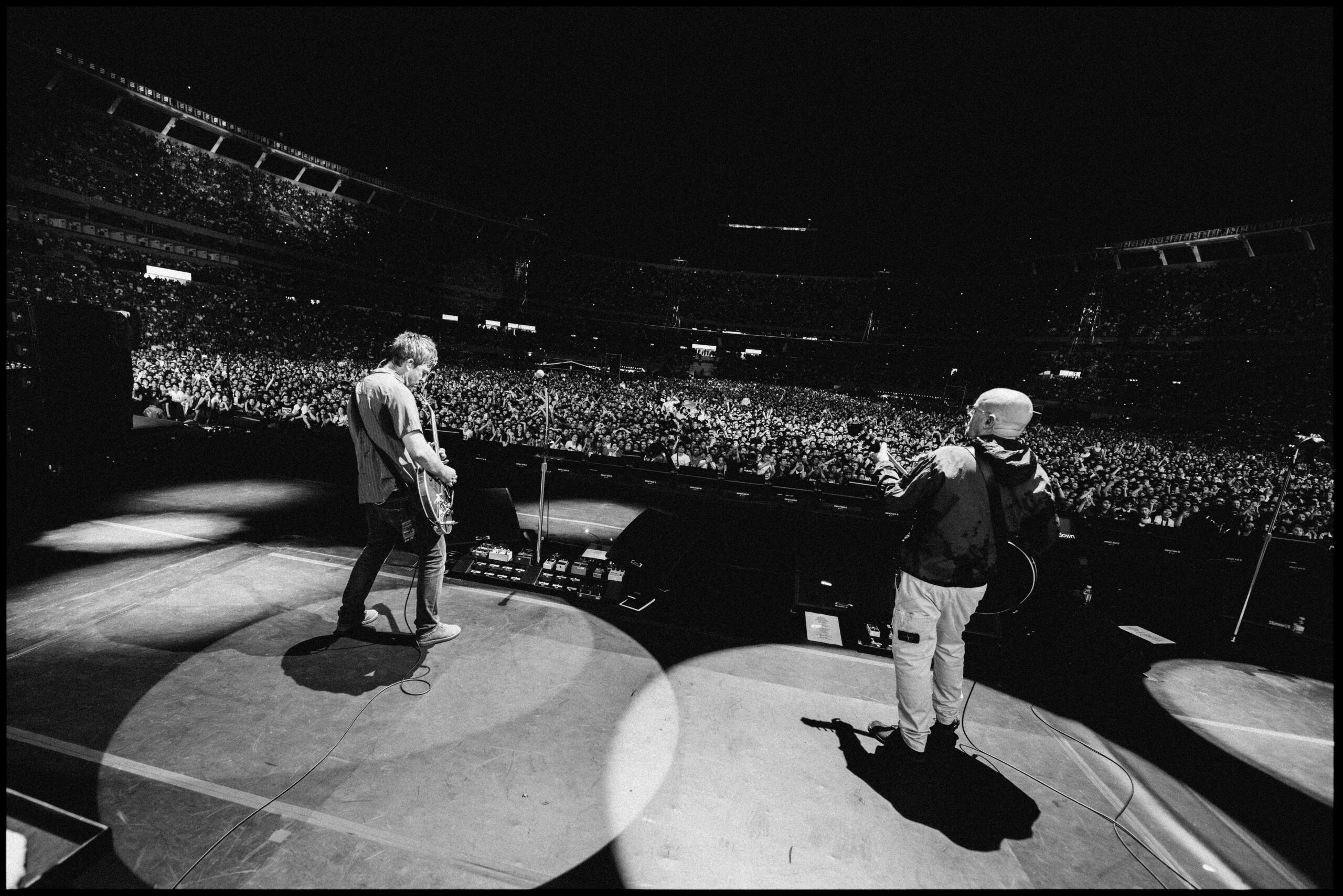 Liam descansa y Noel toma la voz principal y el público en sus manos. Canta dos canciones que son los extremos de ese viaje de vida: Half The World Away (sobre querer irse de un pueblo gris) y Talk Tonight (la compuso cuando abandonó temporalmente una gira, harto de la velocidad en la vida de la banda, en el ’94). Le suma Little By Little para que el estadio sea un solo coro y vuelve Liam para dos tema de Be Here Now, un disco que su hermano consideró maldito pero ahora perdonó. Tocan D’You Know What I Mean y la gloriosa Stand By Me.