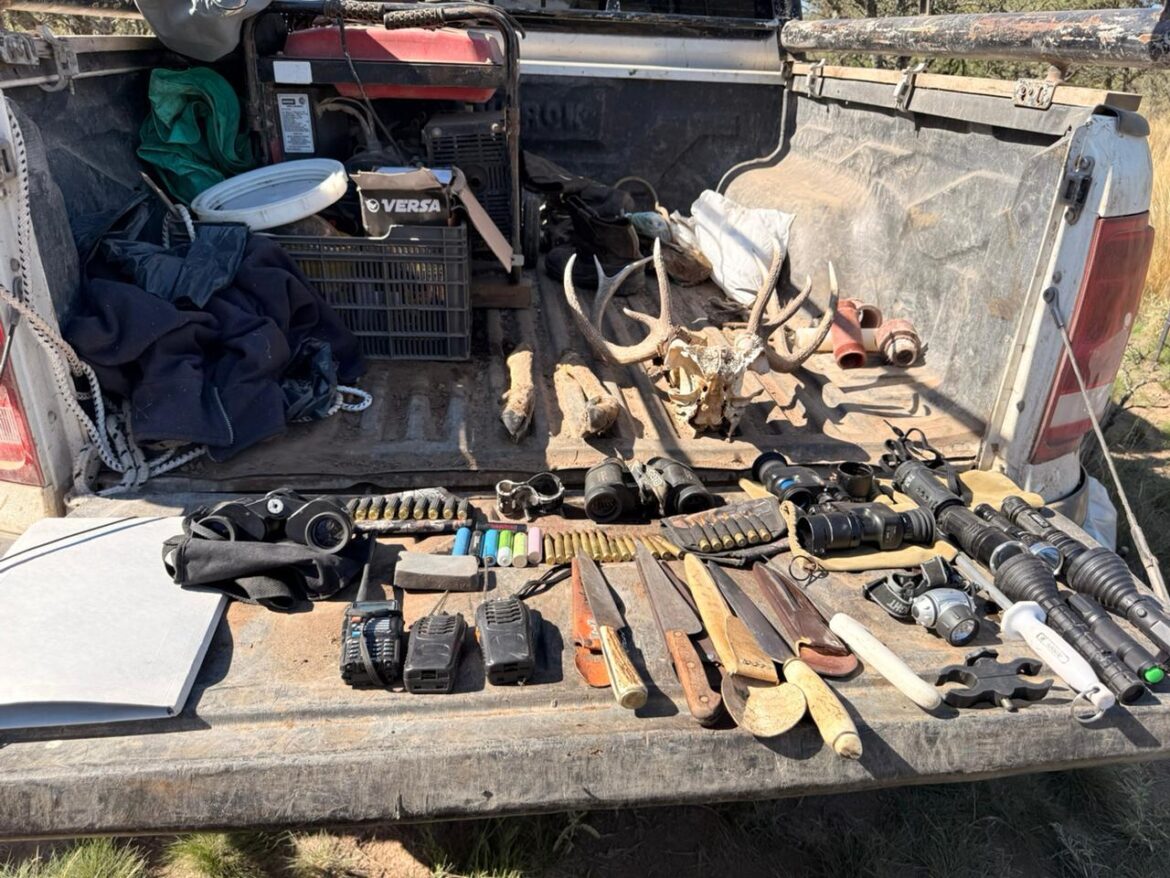 En otro de los operativos, realizado durante una recorrida preventiva en la zona de Naicó, se identificó una pick-up con cuatro ocupantes armados. En las inmediaciones, los efectivos encontraron una cabeza de ciervo colgada de un árbol y bolsas con carne de fauna silvestre.