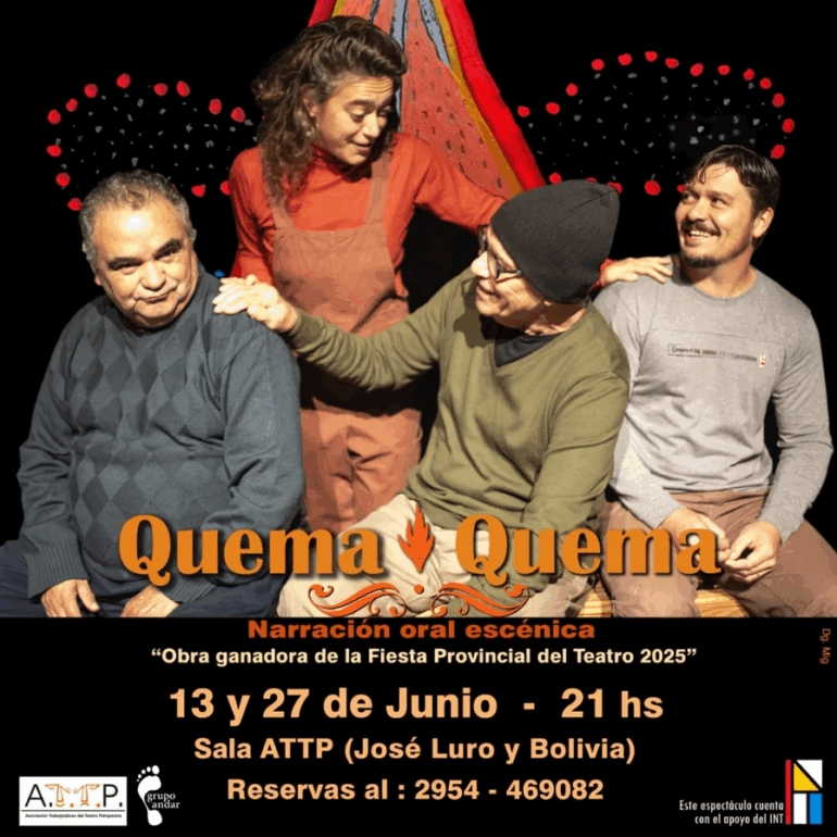 La obra ganadora de la Fiesta Provincial del Taetro 2025, se presenta el 13 y 27 de junio, a partir de las 21 horas, en la sala ATTP, de la ciudad de Santa Rosa. En FM Sonar conversamos con Edith Gazzaniga, actriz y directora, que nos cuenta acerca de este encuentro de cuatro amigxs que se juntan para recuperar historias y personajes de su pueblo natal; Quemú Quemú. Historias que quieren ser contadas, re inventadas y por qué no improvisadas. Además, Edith, una de las referentes del Teatro en La Pampa, advirtió sobre el desmantelamiento que el Gobierno de Milei lleva adelante sobre la cultura, y sobre el teatro en particular.