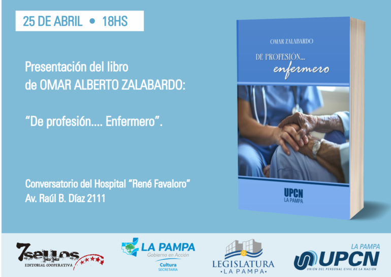 El próximo viernes 25 de abril a las 18:00 hs. se presenta el libro De profesión… Enfermero, de Omar Alberto Zalabardo, publicado por UPCN Seccional La Pampa. El acto se desarrollará en el Conversatorio del Hospital “René Favaloro”, cita en Avda. Cnel. Raúl B. Díaz 2111, con entrada libre y gratuita; con el acompañamiento de la editorial cooperativa 7 Sellos, la Secretaría de Cultura del Gobierno de La Pampa y la Legislatura de la Provincia de La Pampa.