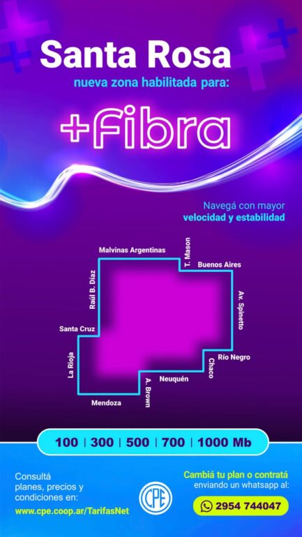 La Cooperativa Popular de Electricidad (CPE) anunció la habilitación de una nueva área con cobertura de fibra óptica al hogar (FTTH) en la ciudad de Santa Rosa, en el marco del avance sostenido de su red de telecomunicaciones.