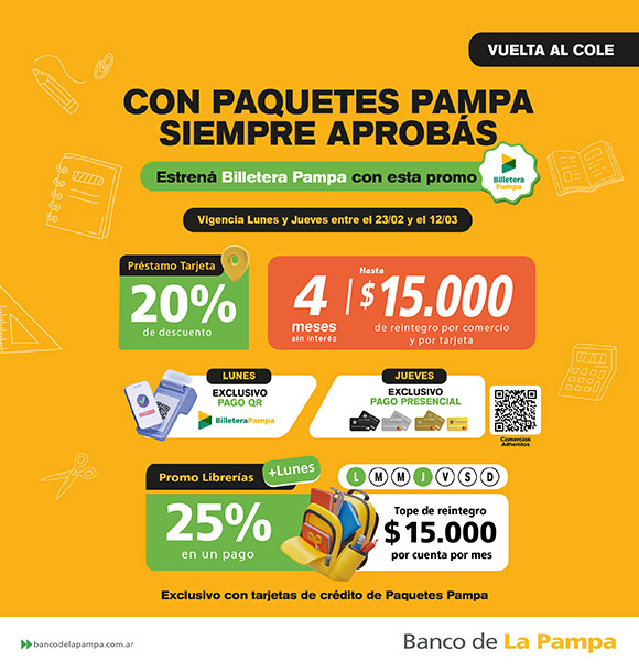 Con estas herramientas financieras, el Banco de La Pampa busca acompañar el comienzo de clases con facilidades de pago y descuentos, en un contexto donde la compra de útiles, indumentaria y materiales escolares representa un gasto significativo para las familias pampeanas.